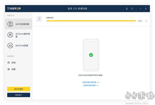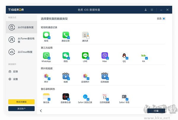 老虎數(shù)據(jù)恢復(fù)電腦版是一款能夠運(yùn)行在Windows和mac OS平臺(tái)里面的數(shù)據(jù)恢復(fù)軟件,軟件界面清爽,功能豐富,用戶能夠快速上手,幫助用戶恢復(fù)iOS設(shè)備的數(shù)據(jù),用戶可以恢復(fù)多種數(shù)據(jù),如短信、通話記錄、照片、通訊錄、日歷、微信聊天記錄、Safari 書(shū)簽、視頻等等,一鍵可以批量恢復(fù),需要的朋友趕快來(lái)kk網(wǎng)站試試吧!