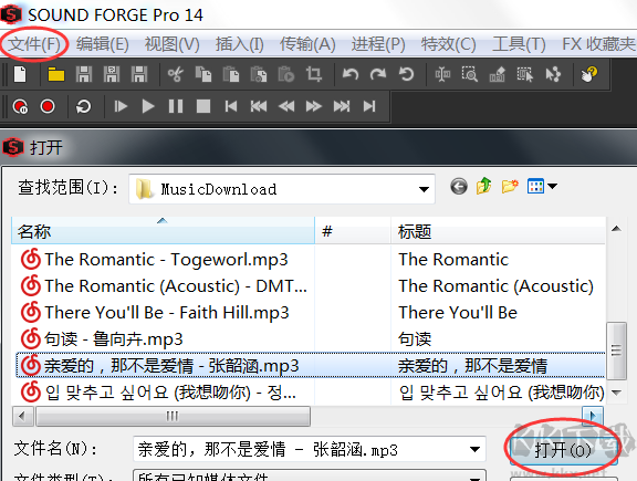 第一步,打開Sound Forge軟件,進(jìn)入到軟件主界面,如圖1所示,點(diǎn)擊“文件-打開”并選擇想要編輯的歌曲,再點(diǎn)擊“打開”,進(jìn)入到歌曲的編輯界面。