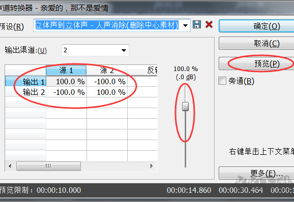 Sound Forge預(yù)設(shè)里的“人聲消除”選項(xiàng)只能簡單的降低人聲,為了將歌曲制作成伴奏,還需要自己手動調(diào)試優(yōu)化。如圖4所示,在“聲道轉(zhuǎn)換器”中,可以通過點(diǎn)擊“預(yù)覽”按鈕來試聽當(dāng)前效果下的歌曲片段。