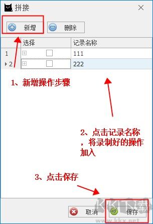 2、點(diǎn)擊新增來增加操作步驟,之后點(diǎn)擊記錄名稱選擇已錄制好的操作加入,如果不需要可以點(diǎn)擊上方的操作,完成后點(diǎn)擊保存