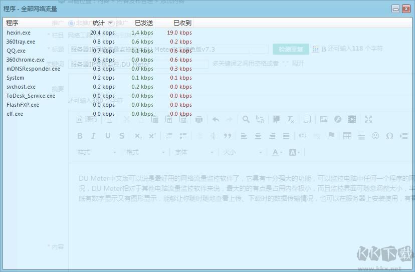 流量監(jiān)控網(wǎng)上并不多,找來找去都是比較簡(jiǎn)單的,要么就是非常復(fù)雜的抓包工具,想看一下某個(gè)IP或是程序消耗了多少流量也困難!好了,有了IP流量監(jiān)控軟件DU Meter這款專業(yè)級(jí)別的軟件,什么事情都不用擔(dān)心了,你不但可以使用在家用電腦上,也可以在服務(wù)器IIS環(huán)境下使用!解決了小編的大難題,KK下載站小編給大家提供的是破解綠色便攜版本,解壓即可使用!