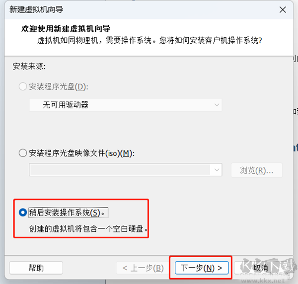 2、選擇稍后安裝操作系統(tǒng),點擊下—步