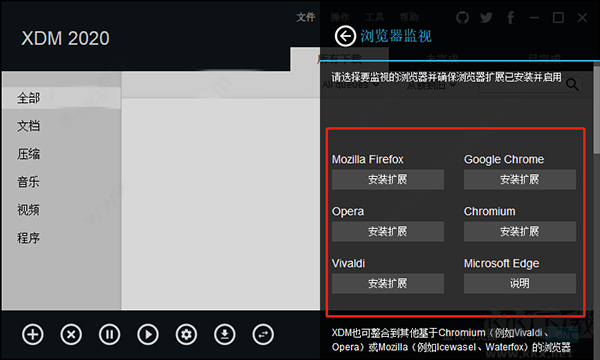 2、可以支持各大主流瀏覽器,如:谷歌瀏覽器,火狐瀏覽器,Opera,Edge,需要在瀏覽器監(jiān)視里面安裝擴展支持,這樣就可以嗅探網(wǎng)頁里的下載地址了;