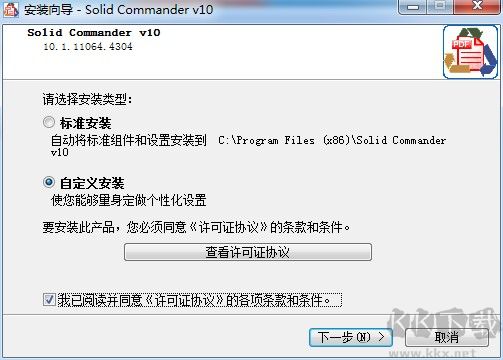 1、在本站下載并解壓,雙擊“solidcommander.exe”運行,安裝原程序,選擇自定義安裝并勾選的同意許可協(xié)議,點擊下一步