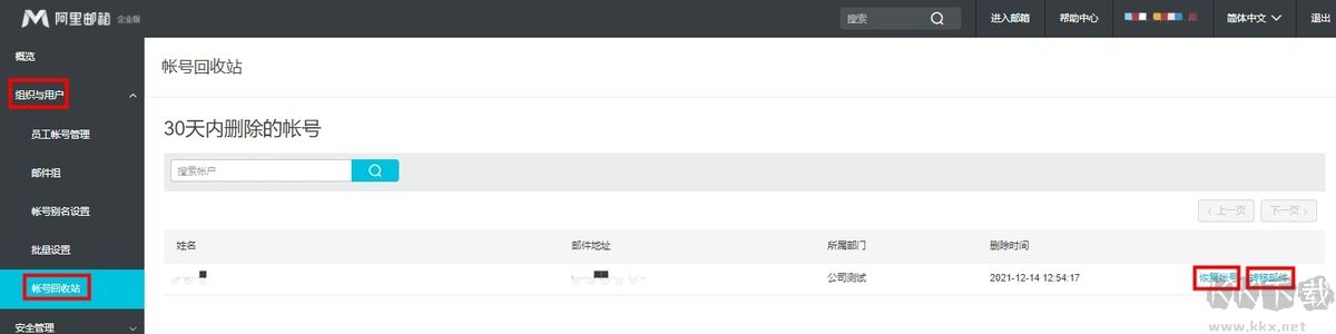 1.被刪除帳號(hào)可在30天內(nèi)通過(guò)帳號(hào)回收站恢復(fù)賬號(hào)或轉(zhuǎn)移郵件。