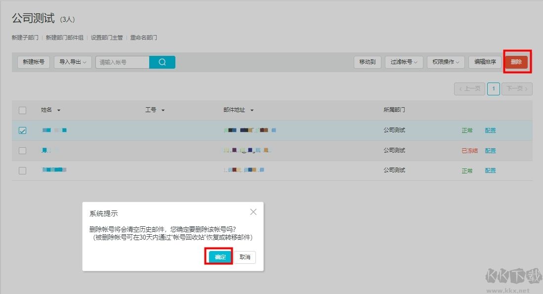勾選需要?jiǎng)h除的賬號(hào)點(diǎn)擊右上角的刪除按鈕,彈出系統(tǒng)提示“刪除帳號(hào)將會(huì)清空歷史郵件,您確定要?jiǎng)h除賬號(hào)嗎”點(diǎn)確定完成刪除操作,被刪除賬號(hào)會(huì)進(jìn)入賬號(hào)回收站中。