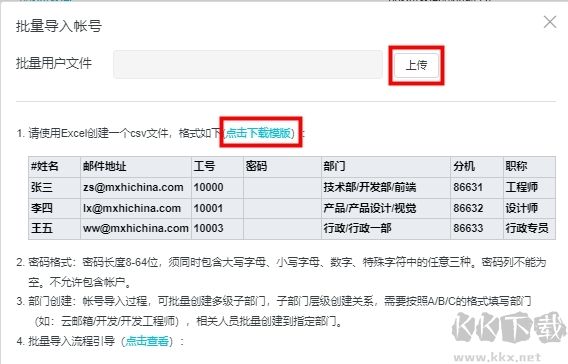 2、通過(guò)導(dǎo)入批量創(chuàng)建賬號(hào),先下載模板,按系統(tǒng)格式要求填寫(xiě)模板后上傳,批量創(chuàng)建賬號(hào)成功。