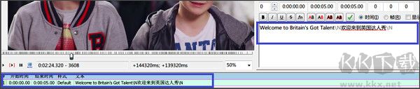 7、然后您就可以輸入字幕了,在下圖的藍色框內(nèi)輸入字幕(本例中N歡迎來到英國達人秀N表示另起一行,并在第二行顯示“歡迎來到英國達人秀”,適用于雙語字幕), 輸入完成后點擊回車鍵,則會自動跳到下一個時間點,暫時不用理會字體格式和時間是否準確。注:如果您輸入的內(nèi)容太多,您可以在需要換行的位置加 N就可以換行了。
