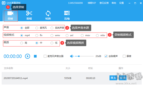 打開Qve屏幕錄制軟件,主界面選擇【錄制】,聲音來源默認(rèn)選擇【全部】,【視頻格式】默認(rèn)mp4,選擇錄制的視頻【畫質(zhì)】默認(rèn)中。