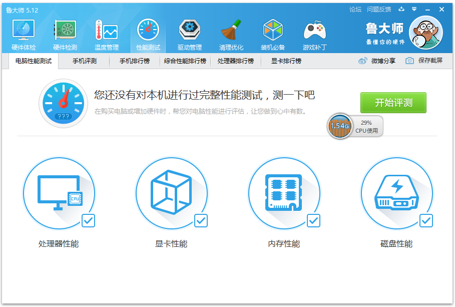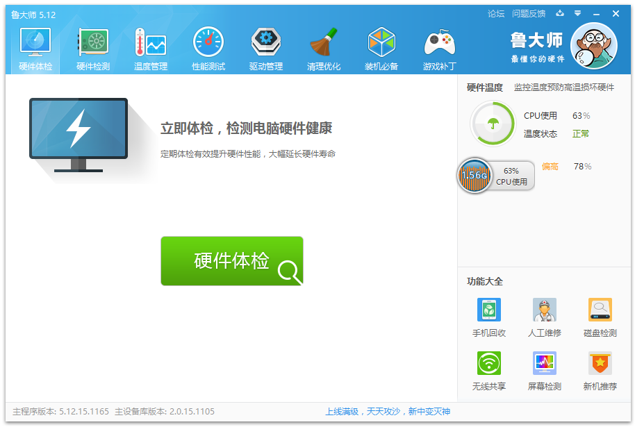 打開魯大師,進入主界面,點擊【硬件體檢】即可檢測電腦硬件;