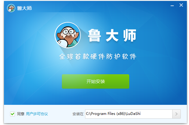 下載魯大師,解壓壓縮包,雙擊.exe文件,彈出界面,閱讀協(xié)議并同意,選擇軟件保存路徑,點擊【開始安裝】,