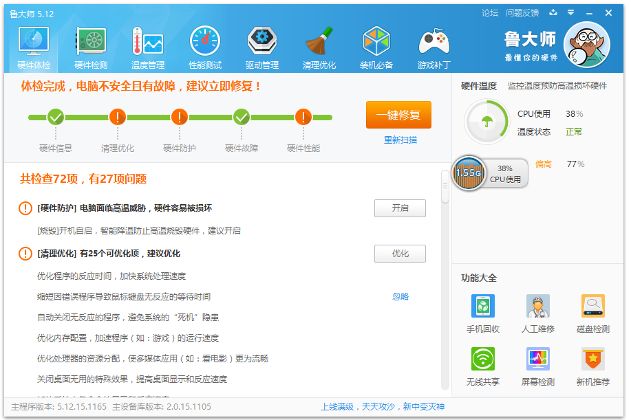 魯大師是一款非常簡單好用的硬件檢測軟件,一鍵檢測電腦硬件詳細信息,讓你對自己的電腦中的各個硬件設(shè)備型號信息一目了然。魯大師內(nèi)置跑分系統(tǒng),在跑分的同時即可對電腦進行壓力測試,很多電腦平時看起來正常,但是使用魯大師跑分的話就可能會出現(xiàn)死機,自動斷電等問題,那么多嘗試幾次,如果問題一樣那么就說明硬件存在問題。