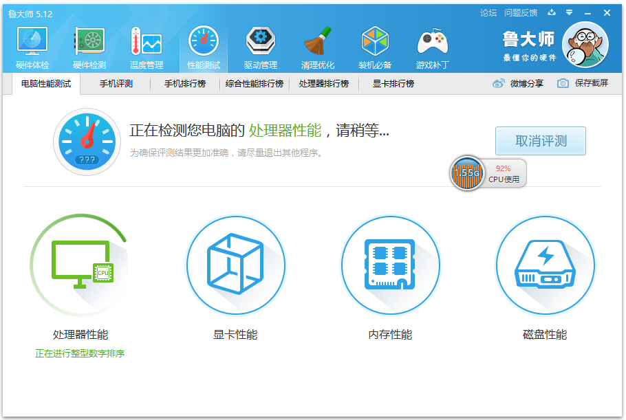 在上方菜單欄中點擊【性能測試】,即可對電腦處理器、顯卡、內(nèi)存、磁盤進行檢測,以及修復;
