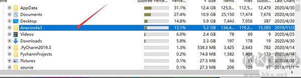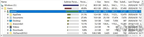 4、目錄樹模式中也配置多種統(tǒng)計(jì)方式,分析之后,你可以看到每個(gè)文件夾的體積、目錄下配置多少文件、與每個(gè)文件夾占用空間的百分比。