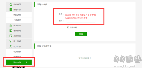 安裝登錄題庫(kù)系統(tǒng)之后點(diǎn)“賬戶(hù)充值” 將獲得的卡號(hào)卡密輸入進(jìn)對(duì)應(yīng)位置點(diǎn)“確認(rèn)”