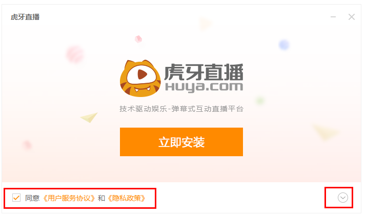 下載虎牙直播,勾選我同意,雙擊.exe文件,彈出界面,閱讀協(xié)議并同意,點(diǎn)擊下拉按鈕;
