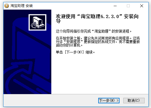 歡迎使用“淘寶助理6. 2. 3. 0”安裝向?qū)н@個(gè)向?qū)⒅敢阃瓿?ldquo;淘寶助理”的安裝進(jìn)程。議先關(guān)閉其他所有應(yīng)用程序。這將允許“量新稽楚的系統(tǒng)文件,需不需要重薪啟動(dòng)你的計(jì)算機(jī)。