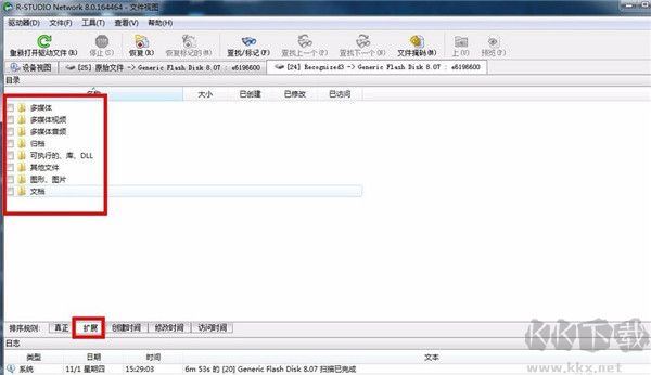 5、接著軟件就開始掃描U盤的文件信息,右側(cè)是以小方格顯示的,下方會有顏色對應(yīng)的說明,在軟件界面最下方是掃描的進(jìn)度,有已用時間和剩余時間,這樣就能很直觀的了解掃描的情況。