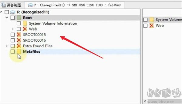 6、等待掃描完成后,在左邊的設(shè)備列表中就可以看到u盤名稱下邊多了幾個選項,有原始文件,還有掃描到的文件,名稱顯示的顏色也是不一樣的,選擇其中的橙色文件名稱。