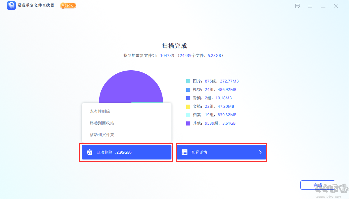 掃描完成后,會(huì)出現(xiàn)掃描完成界面,可直接點(diǎn)擊「自動(dòng)移除」,會(huì)出現(xiàn)永久性刪除、移動(dòng)到回收站、移動(dòng)到文件夾三個(gè)選項(xiàng),請(qǐng)根據(jù)自己的需求選擇;也可點(diǎn)擊「查看詳情」進(jìn)入「重復(fù)文件報(bào)告」頁(yè)面。