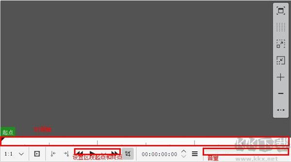 被框出的兩個按鈕用于設(shè)置預(yù)覽窗口時間軸上預(yù)覽區(qū)段的起點和終點,“播放”按鈕右部的小箭頭下拉框中可以選擇“播放區(qū)段”