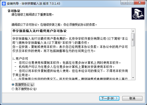 華宇拼音輸入法V7對(duì)最終用戶是免費(fèi)的。北京華宇軟件股份有限公司(以下簡(jiǎn)稱“本公司")擁有華宇拼音輸入法(以下簡(jiǎn)稱“本軟件”)的著作權(quán)。
