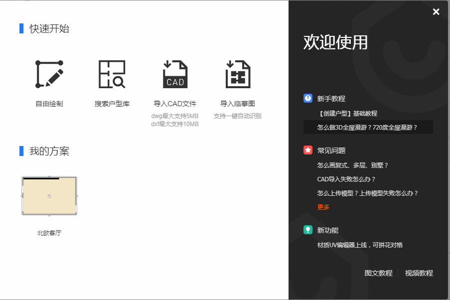 進(jìn)入設(shè)計工具界面,在彈出窗口中有四種創(chuàng)建戶型的方式可供選擇,即"自由繪制、搜索戶型庫、導(dǎo)入CAD文件、導(dǎo)入臨摹圖”。