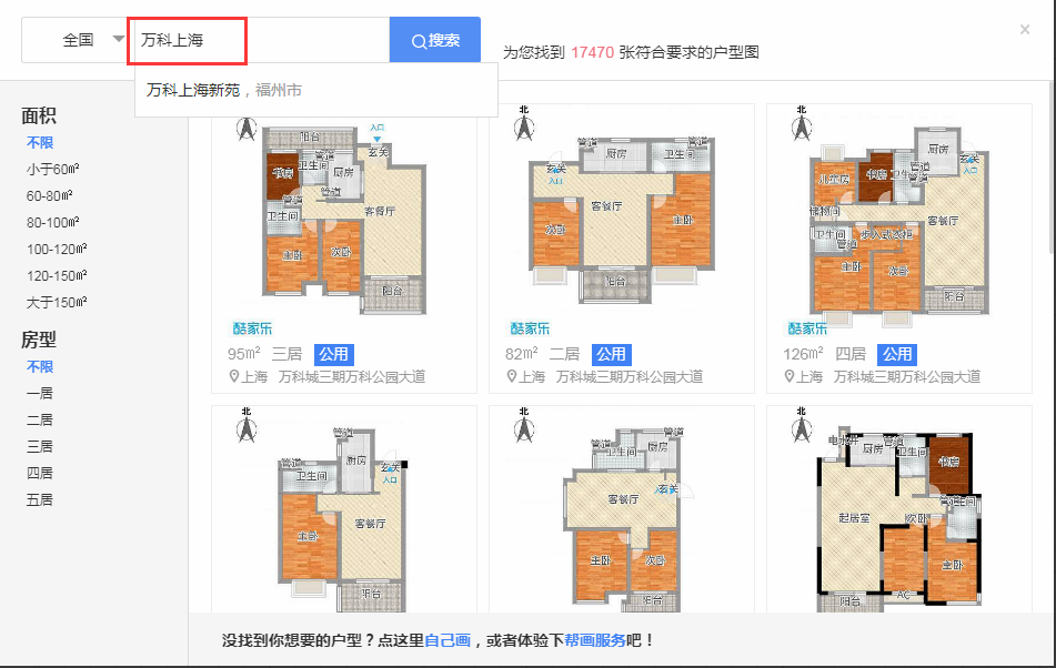 tips:如果沒有找到想要的戶型圖,可以點(diǎn)擊搜索頁面下方的“自己畫”或選擇“幫畫服務(wù)”。