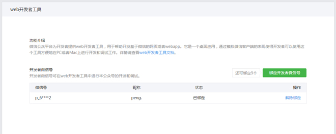 為了保證開發(fā)者身份信息的安全,對于希望調(diào)試的公眾號,我們要求開發(fā)者微信號與之建立綁定關(guān)系。具體操作為:公眾號登錄管理后臺,啟用開發(fā)者中心,在開發(fā)者工具——web 開發(fā)者工具頁面,向開發(fā)者微信號發(fā)送綁定邀請。綁定頁面如下圖所示: