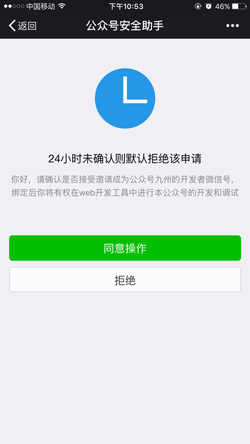 開發(fā)者在手機微信上接受邀請,即可完成綁定。每個公眾號最多可同時綁定10個開發(fā)者微信號。邀請確認頁面如下圖所示: