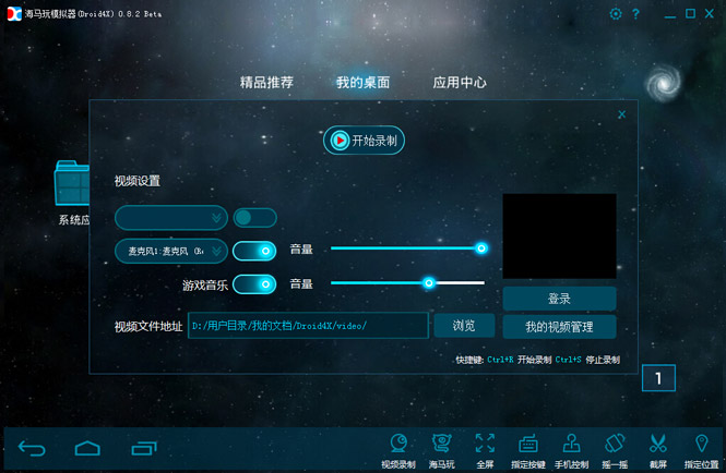打開這個(gè)功能后會(huì)出現(xiàn)基本設(shè)置界面。在這里玩家可以自由設(shè)置是否錄制麥克風(fēng)聲音,是否錄制游戲音樂(lè),調(diào)整音量,設(shè)置保存位置,以及登陸海馬玩帳號(hào)管理已經(jīng)上傳的各種視頻。