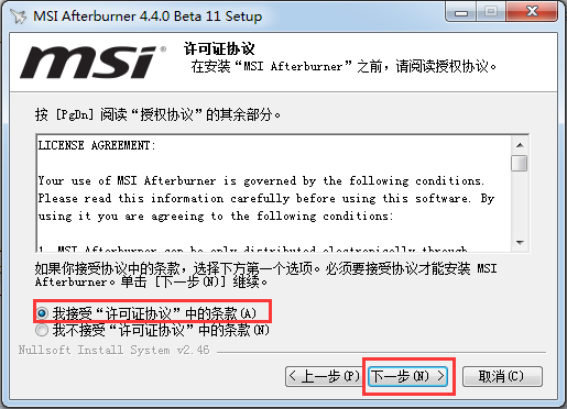 在安裝“MSI hfterburner"之前,請(qǐng)閱讀授權(quán)協(xié)議。點(diǎn)擊同意此協(xié)議,點(diǎn)擊下一步