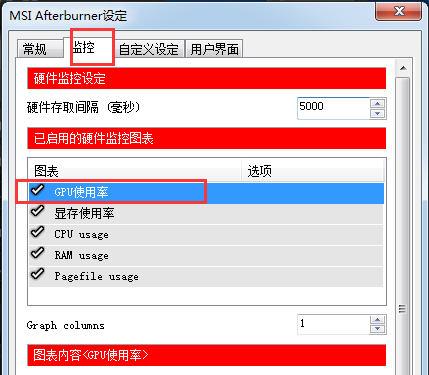 2.在”已啟用的硬件監(jiān)控圖表“點(diǎn)擊你想監(jiān)控的項(xiàng)目,以cpu使用率為例,使幀率項(xiàng)變成高亮的藍(lán)色;