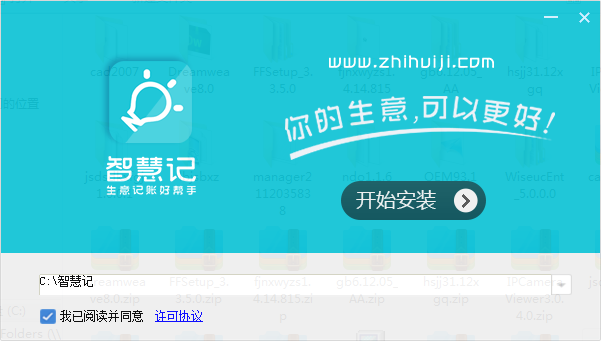 1.將kkx分享的壓縮包下載解壓安裝智慧記,打開安裝程序,默認(rèn)安裝路徑:C:\智慧記。也可以選擇安裝位置,點擊開始安裝