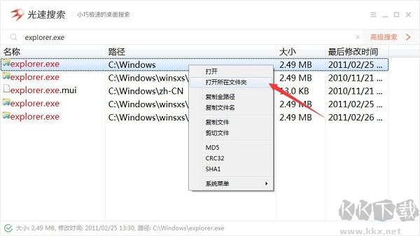 4、 通過右鍵點(diǎn)擊文件,可執(zhí)行打開、打開所在文件夾、復(fù)制全路徑、復(fù)制文件名、復(fù)制文件、剪切文件、獲取 MD5 值、獲取 CRC32 值、獲取 SHA1 值等操作 。