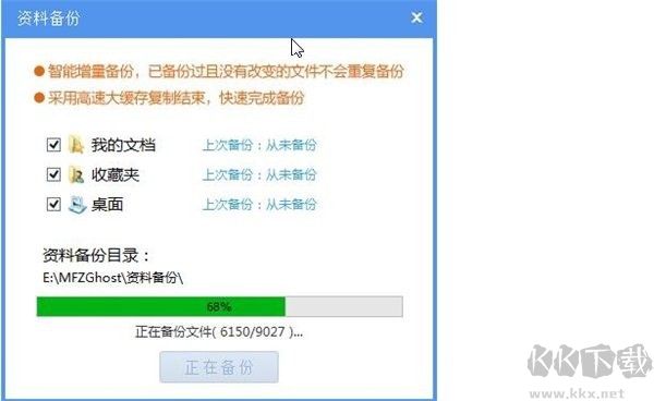 2、軟件自動備份系統(tǒng)盤(通常為 C 盤)中的我的文檔、收藏夾和桌面資料,存儲于磁盤最大分區(qū)的 X:MFZGhost 資料備份文件夾,1 - 2 分鐘完成備份后自動跳轉(zhuǎn)。