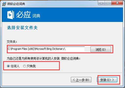 3.你可以默認軟件安裝位置(C: IProgram Files (x86)VMicrosoft Bing Dictionary\)也可以點擊瀏覽選擇安裝位置;