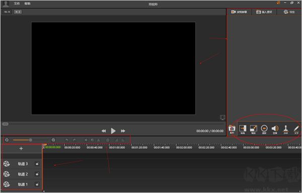 7、編輯界面分三部分,上部左為播放窗口,右為素材特效設(shè)置,下部用于素材編輯。