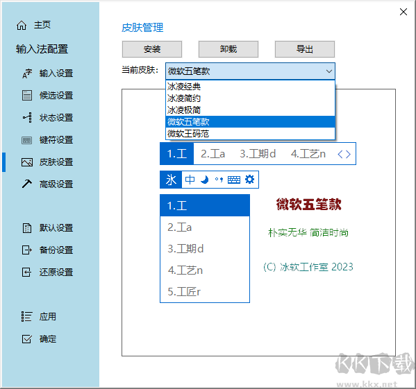 6、在【皮膚設(shè)置】界面,可安裝、卸載、導(dǎo)出或切換輸入法皮膚。