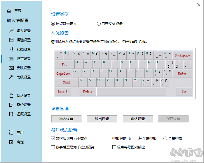 5、在【鍵符設(shè)置】界面,可設(shè)置標(biāo)點(diǎn)符號(hào),自定義軟鍵盤(pán)布局。