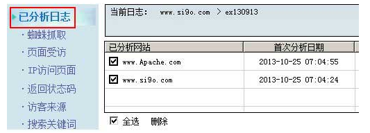 1、單擊“已分析日志”,如果已經(jīng)分析了兩個(gè)以上的網(wǎng)站,會(huì)顯示它們的域名,單擊“全選”選中它們,如圖所示: