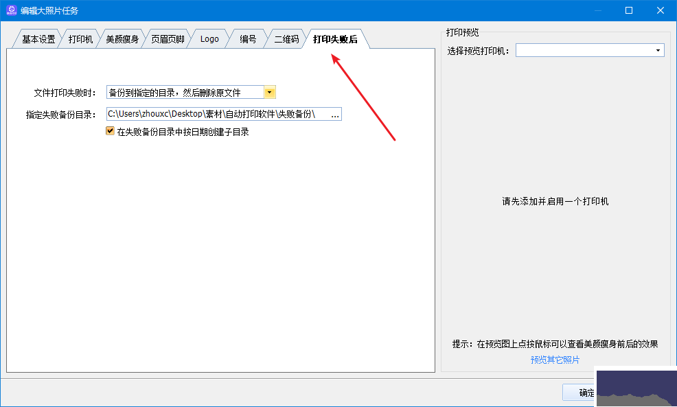 2.將 “文件打印失敗時(shí)” 設(shè)置為 “備份到指定的目錄,然后刪除源文件”,選擇保存失敗照片的文件夾。