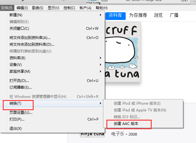 3、然后點擊文件,在彈出的選項中選擇【轉換】,在二級菜單中點擊【創(chuàng)建AAC版本】。