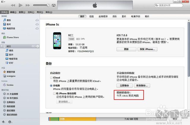 4、視你文件多少,備份時間不定,等待備份完成之后在iTunes界面中部的“備份”界面中,就可以看到“最新備份”時間等信息了,如下圖所示。