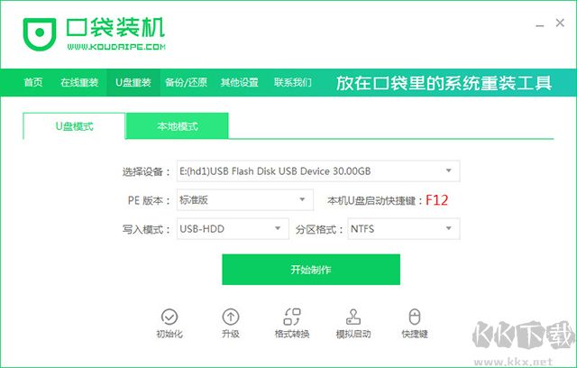 1、下載安裝口袋裝機(jī)程序,插入 U 盤后點(diǎn)擊 U 盤重裝系統(tǒng)。