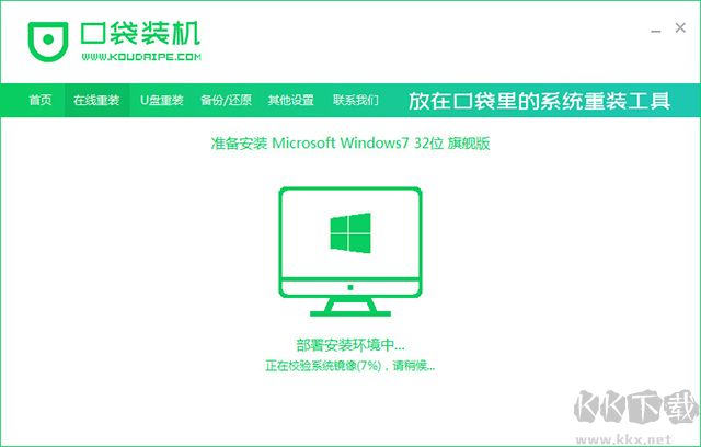 1、重裝系統(tǒng) win7 旗艦版需先下載口袋裝機(jī)工具,打開后點(diǎn)擊在線安裝系統(tǒng)。
