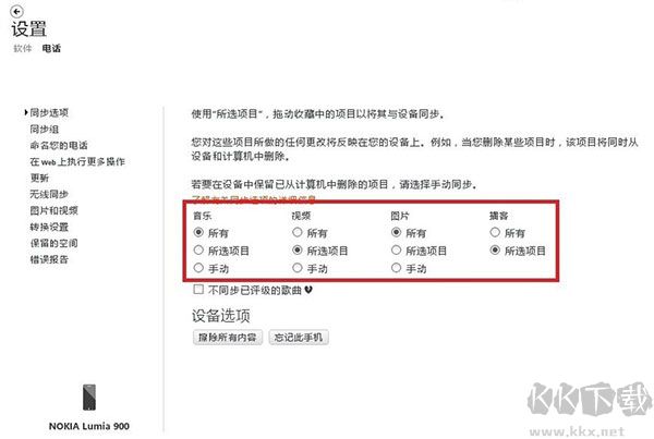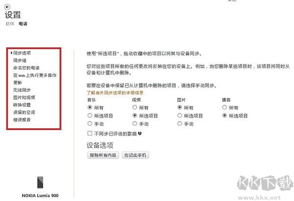 5、我們看到有“同步選項(xiàng)”“同步組”“命名您的電話”等,首先看一下“同步選項(xiàng)”,有“所有”“所選項(xiàng)目”“手動(dòng)”三種選擇,作者一般將音樂和圖片的變化進(jìn)行全部同步,而視頻和博客基本不使用,可選如圖