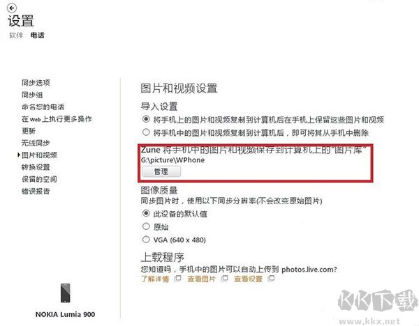 7、“圖片和視頻”,在這里可以設(shè)置電腦端保存圖片的位置,之后Zune啟動(dòng)時(shí),會(huì)根據(jù)這個(gè)目錄自動(dòng)檢測(cè)與手機(jī)端是否圖片視頻同步,如圖