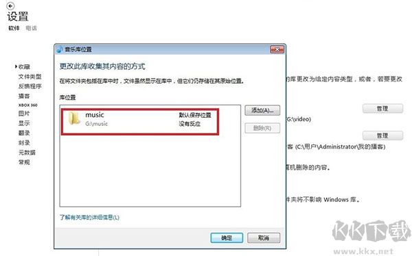 9、“收藏”,這里可以設(shè)置所用的文件的存儲(chǔ)位置,拿“音樂”進(jìn)行講解,點(diǎn)擊“音樂”,彈出“音樂庫位置”界面,通過添加和刪除位置,配置音樂庫位置,完成后點(diǎn)擊“確定”,如圖