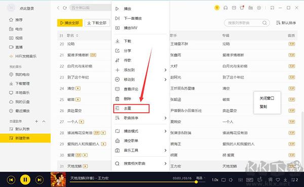 在播放列表中點擊鼠標(biāo)右鍵,選擇去重功能即可。